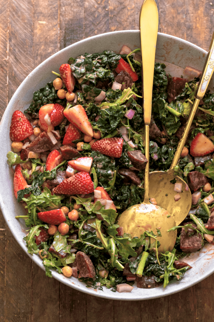 This vegan and gluten-free summer Strawberry Salad is made with your choice of spinach or kale, arugula, fresh strawberries, chickpeas, red onion, beetroot, and the best, tangy Strawberry Balsamic Dressing! Ideal for healthy meal prep, potlucks, or easy dinners when it’s too warm to cook!