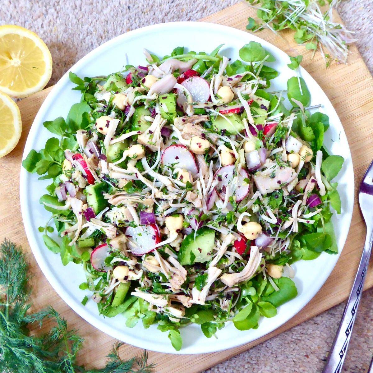 This protein-packed salad makes a delicious lunch anytime. No cooking is needed, simply assemble and dress!