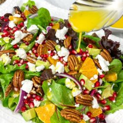 I’m always looking for new exciting salad recipes to mix things up, and this Mediterranean-inspired Easy Orange-Pomegranate Salad with Goat Cheese is definitely a winner. The sweetness of the oranges is perfectly balanced by the tartness of the pomegranate arils (seeds). The goat cheese and avocado add a creamy richness that contrasts with the crunchiness of the nuts and pairs perfectly with the sweet and tart fruits. In addition, the onion and the refreshing Orange Champagne Vinaigrette dressing add brightness, zing, and complexity.