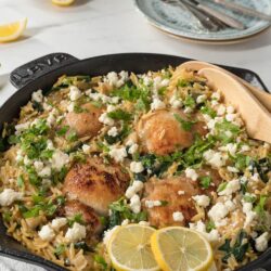 Place the chicken and any accumulated juices on top of the orzo.