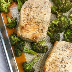 Looking for an easy weeknight dinner idea? Try these sheet pan pork chops with garlic broccoli! With just a few ingredients and one pan, dinner is ready in less than one hour!