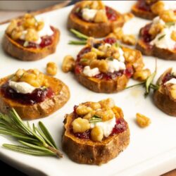 This Sweet Potato Bites Cranberry Sauce, Goat Cheese, and Walnuts are a delectable, festive, and holiday-appropriate appetizer. Roasted sweet potato rounds are topped with sweet and tart cranberry sauce, crunchy, nutty walnuts, rich goat cheese, and a touch of rosemary. The result is a delicious and beautiful canapé perfect for Thanksgiving or holiday entertaining as it has all the seasonal flavors and colors. Plus, they’re easy to make and require just a few ingredients. So whether you’re hosting a holiday party or attending one, this appetizer will surely be a hit!