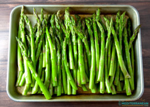 When the asparagus is evenly coated, spread into a single layer without overcrowding.