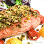 Melt-in-your-mouth salmon, baked to perfection, has pistachio with cardamom crust on top, giving it a fantastic flavor and texture. This Pistachio Crusted Salmon With Blistered Cherry Tomatoes is delicious, easy, and perfect for a weeknight dinner yet elegant and impressive to serve as the main course for a dinner party.